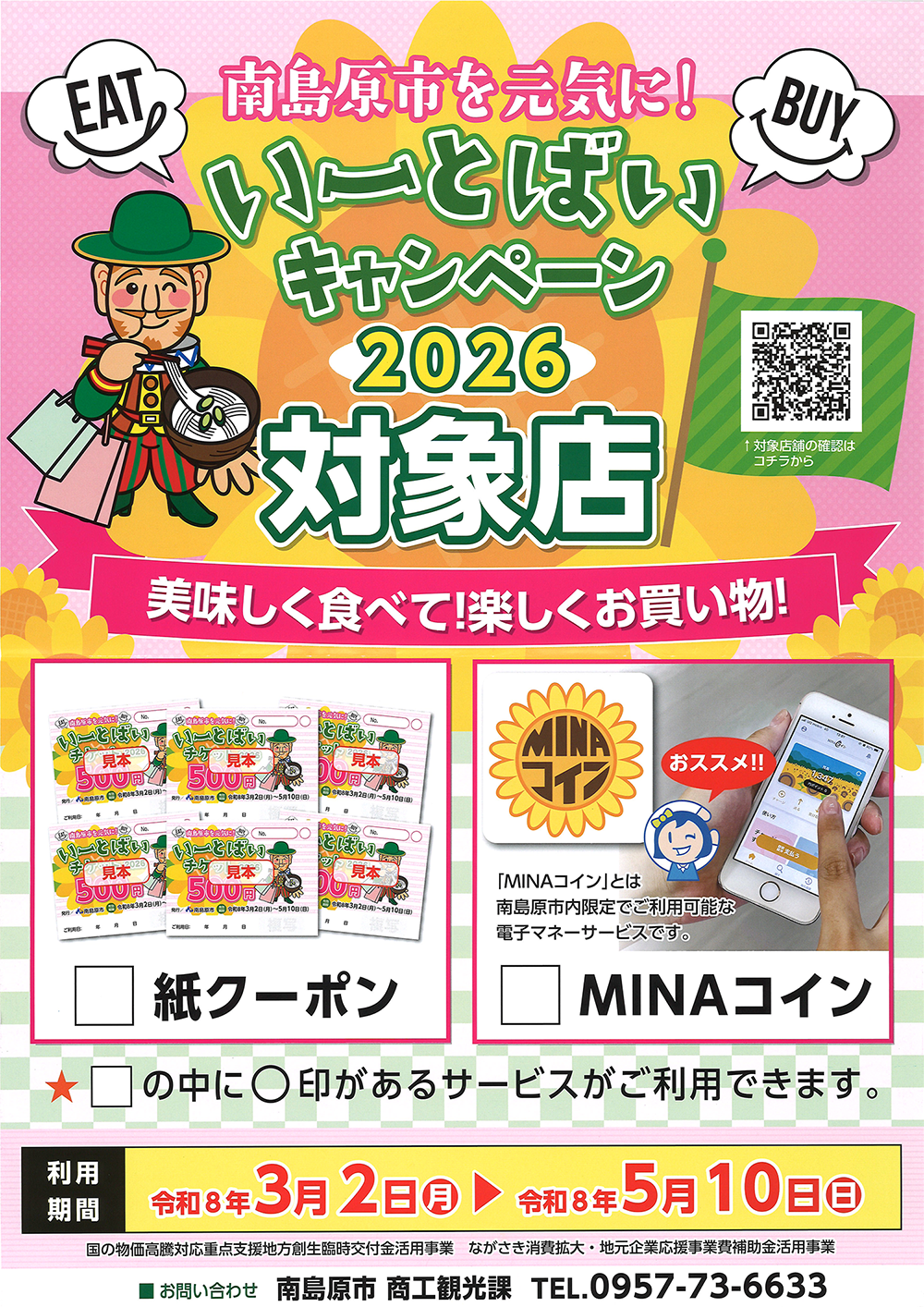 3月2日(月)より南島原市民を対象とした『南島原市を元気に!いーとばいキャンペーン2026』が始まりました。当店では、「紙チケット」も「MINAコイン」も、どちらも使えます!